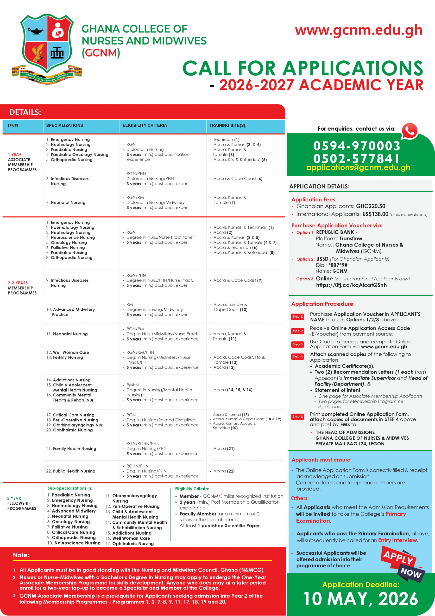 The Ghana College of Nurses and Midwives (GCNM) was established in 2011 by the SPECIALIST HEALTH TRAINING AND PLANT MEDICINE RESEARCH ACT, 2011 (ACT 833) Part Three, and was inaugurated in 2013 to promote specialist education, continuous professional development and postgraduate nursing, midwifery and related programmes and contribute to the formulation of policies to improve health outcomes.